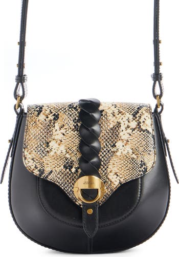 A braided leather strap slips through the golden, logo-engraved closure on the snakeskin-embossed flap of this softly structured shoulder bag crafted from smooth calfskin.