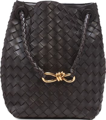 Italian for 'let's go,' this aptly named bucket bag—made from calfskin leather in the label's signature intrecciato technique and featuring a dual-compartment interior—makes an ideal everyday bag. Your carrying options are doubled by a pull-through intrecciato strap with a signature knot detail and removable crossbody strap.