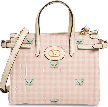 Side gussets with adjustable belts allow you to fit the capacity to the cargo in this compact tote made from cotton-and-linen canvas in cat-fancied gingham pattern and is trimmed in leather and signature VLOGO hardware.