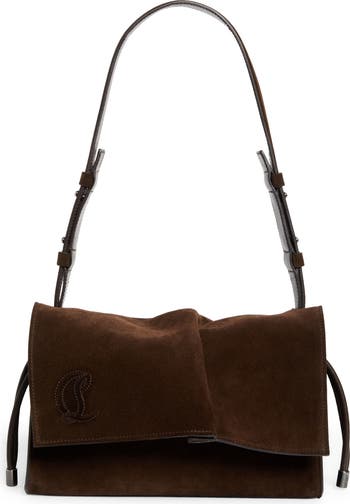 An embossed CL Mooncrest logo brings subtle branding to this compact shoulder bag designed in a gorgeously slouchy silhouette in velvety suede. A Louboutin-red lining puts the designer's signature stamp on the look.