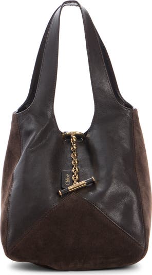 Made from grained buffalo leather and calfskin suede, this compact hobo bag showcases a rounded, unstructured silhouette finished with an equestrian-inspired toggle-and-chain clasp. The maision's siganture horse medal brands the base of the bag.