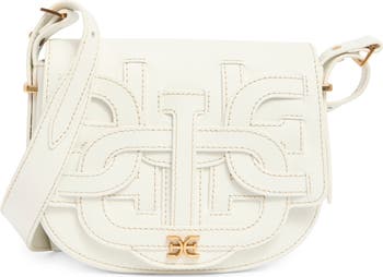 Artfully interlocking panels traced with contrast topstitching mirror the ornately shaped double-E hardware of this smooth leather saddle bag suspended from a guitar-style crossbody strap.