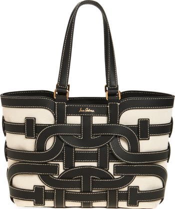 Artfully interlocking panels traced with contrast topstitching mirror the brand's signature motif on this durable canvas tote featuring a spacious interior and slim top handles.