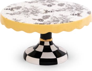Hand-painted checks, bees and delicate toile flowers combine to striking effect on this porcelain pedestal platter that adds welcoming warmth to your tablescape.