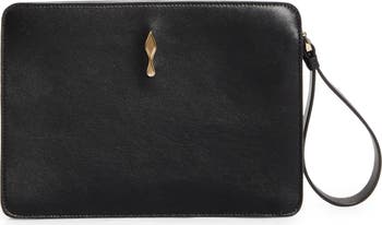 New metal hardware that evokes the silhouette of the label's iconic sole adds a golden gleam to this minimalist pouch crafted in Italy from smooth napa leather. It comes with a wrist strap for a convenient hands-free carrying option.
