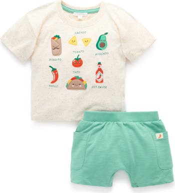 Our Small Bites Set takes the fuss out of outfitting with the perfect matching pieces! Featuring a soft jersey tee with a fun applique of burritos, tacos and more, and comfortable shorts made from stretchy unbrushed fleece. Made from our 100% Cotton for a soft and breathable outfit, ideal for those warm sunny days.