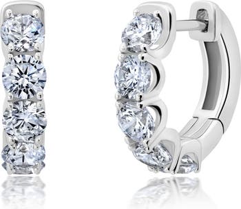 Round-cut cubic zirconia sparkle brilliantly along the curves of these stunning hoop earrings plated in platinum or 18-karat gold.