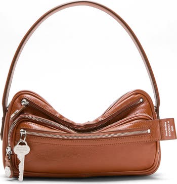 A slouchy silhouette detailed with gleaming moto-inspired hardware and a logo-engraved key charm rev up the appeal of this leather shoulder bag that made its debut on the label's spring '25 runway. A removable crossbody strap offers an added carrying option.