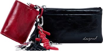 A mini card holder and playful charms are optional attachments on this faux-leather wallet.