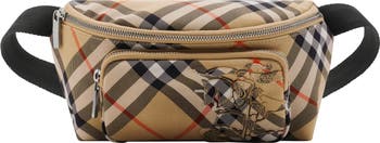 A belt bag woven in the Burberry Check and appliquéd with our Equestrian Knight Design. The style features B-cut zip pulls and a shield-shaped clip. Wear on the waist or style as a crossbody using the adjustable strap.||Adjustable webbing strap|Two-way zip closure|Exterior zip pocket|Brushed metal hardware|Appliquéd Equestrian Knight Design at front|Unlined|Comes with a dust bag