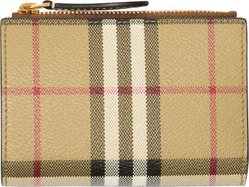 A bifold wallet made from a coated cotton blend printed with the Burberry Check. The press-stud design is lined with smooth calf leather and features multiple card slots and a zip pocket.||Press-stud closure|Six card slots|Zip compartment|Two slip pockets|Note compartment|Hand-painted edges|Polished metal hardware|Embossed Burberry lettering at inner|Comes with a dust bag