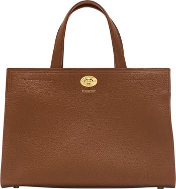 A timeless tote made in Italy from grainy calf leather, lined in a cotton blend woven with the Burberry Check in our signature sand colourway. The spacious design is detailed with a check-engraved closure and D-ring hardware inspired by the belt from our iconic trench coats. Carry in hand or as a shoulder bag using the strap.||Detachable, adjustable strap|Top handles|Twist-lock closure|Side adjusters|Interior zip pocket|Hand-painted edges|Brushed metal hardware|Embossed Burberry lettering at front|Burberry Check lining|Comes with a dust bag