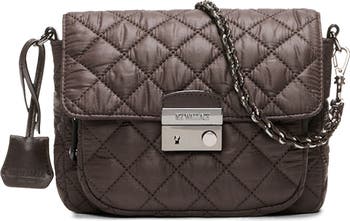 Gleaming logo hardware and diamond quilting distinguish an organized nylon crossbody bag fitted with a multitude of straps for easy on-the-go styling.