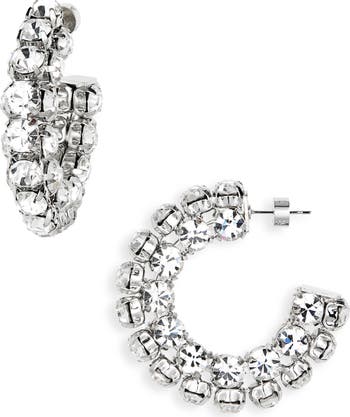 The shine of a disco ball acts as the inspiration of these twinkling hoop earrings made with rows of faceted prong-set crystals.