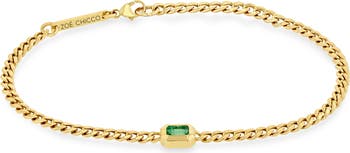 A bezel-set rectangular emerald enriches this gleaming curb chain bracelet of 14-karat gold.