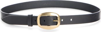 This leather belt reimagines Western-inspired design through a polished goldtone buckle that delivers an unmistakable statement.