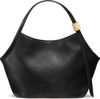 A slightly slouchy topline brings geometric structure to a scaled-down bag featuring a rich leather exterior and suspended from and optional crossbody strap for hands-free wear.