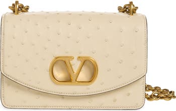 Valentino's DeVain bag is an instant classic in textural ostrich leather with golden VLOGO hardware gleaming on the front of the structured style. The pull-through chain strap easily adjusts for shoulder or crossbody wear, while the compact size and organized interior make it perfect for carrying your daily essentials.