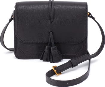 Swingy tassels accent the textured leather exterior of a compact crossbody bag designed with multiple interior pockets and suspended from an adjustable strap.