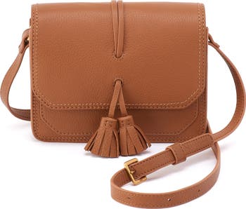 Swingy tassels accent the textured leather exterior of a compact crossbody bag designed with multiple interior pockets and suspended from an adjustable strap.