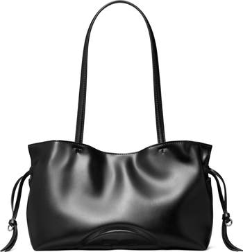 This soft and slouchy drawstring tote crafted from supple faux leather is designed with signature double Ts and an oversized base.