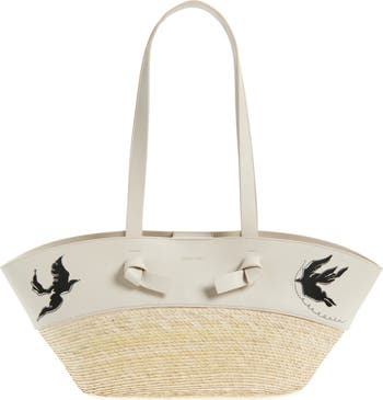 Crafted from a combination of embroidered leather and summery straw, this basket-inspired bag is finished with a glinting foil logo and playfully knotted shoulder straps.