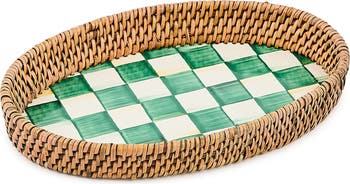 Signature hand-painted checks complement the intricately woven rattan on this oval tray that's perfect for serving small bites to your party guests or as a decorative accent piece.