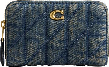 Quilted, specially treated denim and antiqued hardware add an aged, love-worn look to this compact card case that features an accordioned interior secured with a zip-around closure.