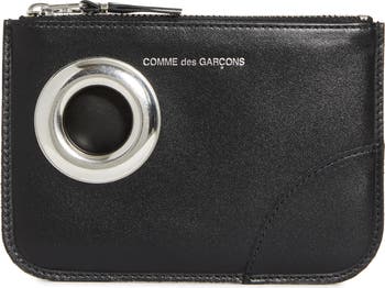 An oversized eyelet dominates this small zip pouch crafted from richly grained calfskin with a shiny silverfoil logo.