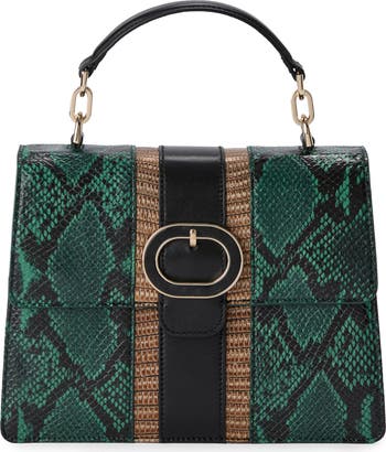 Snake-embossed leather shapes the structured profile of a scaled-down leather bag featuring an easy carry handle and optional crossbody strap for convenient wear.