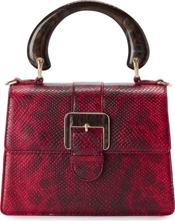 Snake-embossed leather shapes the structured profile of a scaled-down leather bag featuring an easy carry handle and optional crossbody strap for convenient wear.