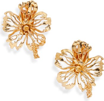 Botanical beauty becomes sculptural adornment in this these gilded hibiscus-inspired earrings.
