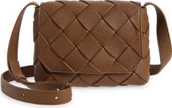 A handwoven intrecciato exterior distinguishes a richly grained messenger bag styled with a slim, square profile and interior pockets for small essentials.