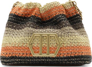 Brushed, geometric hardware highlights the finely woven exterior of a Brazilian-made bag featuring a slouchy profile and chain crossbody strap for a boho aesthetic.