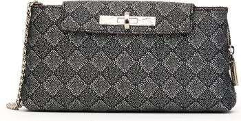 Glossy studs and red lining add signature elements to a diamond-patterned jacquard clutch featuring multiple compartments and suspended from an optional chain strap.