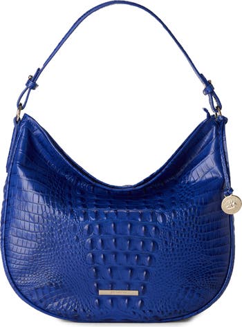A draped topline and scaled-down profile define a croc-embossed leather shoulder bag designed with a roomy interior and multiple pockets for easy organization.