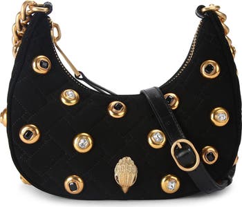Gem-centered studs and a glinting eagle head add signature opulence to the quilted suede exterior of a scaled-down hobo bag suspended from an adjustable shoulder strap for comfortable wear.