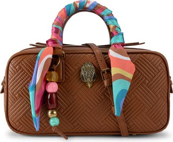 A signature crystal-encrusted eagle head and a colorfully beaded tassel stand out against the finely quilted exterior of an elevated leather duffle bag shaped in a compact silhouette. A vibrant scarf enriches the top carry handles and a removable crossbody strap offers versatile wear.