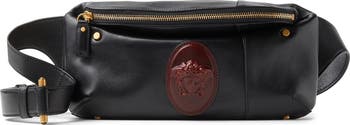A molded Medusa head is cast in crimson to look like a wax seal on this luxurious belt bag shaped from glossy Italian lambskin.