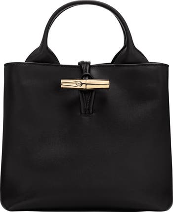 A bamboo-inspired toggle closure stands out against the smooth leather of scaled-down tote fitted with an optional crossbody strap for hands-free wear.