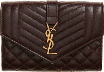 The iconic Cassandre monogram originally designed in 1961 centers this envelope-style leather wallet textured with an artful mix of diamond and channel quilting.