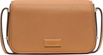 A signature logo plague highlights the richly pebbled leather exterior of a structured bag designed with multiple pockets and suspended from an adjustable crossbody strap.