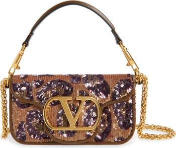 Oversized VLOGO hardware puts a house-signature finish on this scaled-down silk shoulder bag covered in light-catching sequins designed to mimic leopard print.