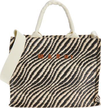 An embroidered logo fronts this summery Italian-crafted tote woven for a raffia-like effect and framed with calfskin-leather trim.