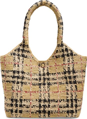 This lightweight tote is made for sunny days and summery escapes. Raffia palm leaves are dyed in house-signature colors before being hand-crocheted into the iconic check and shaped into a beach-style tote design.