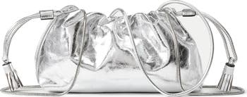 Crafted from premium metallic leather with a crinkled finish, this pouch bag features a softly structured silhouette with a gathered, cinchable top and is finished with tasseled drawstrings at both ends. Two straps—one in smooth leather, the other a snake chain—offer maximum versatility.