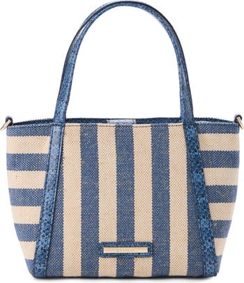 Woven panels gets doused in nautical stripes on a compact tote trimmed with leather shoulder straps and an optional crossbody strap.
