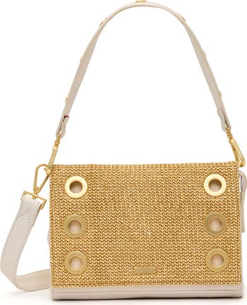 Grommets and studs gleam on a structured clutch featuring a multitude of compartments and two optional straps for on-the-go convenience.