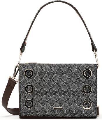 Diamond-patterned jacquard and contrasting leather bring textural interplay to a structured clutch featuring a multitude of compartment and optional straps for on-the-go convenience.