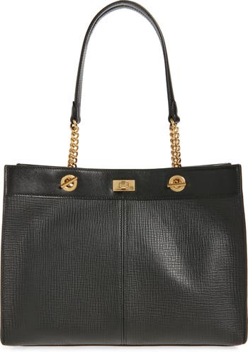 The label's fan-favorite Mortimer tote is updated in crosshatched calfskin with chain-detailed top handles—that are long enough to sling over your shoulder.